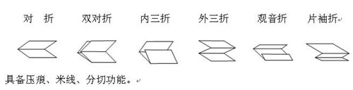 先进的光电与数码控制系统,6位数计数器可设定数量不停机,折叠准、速度快、小巧精致、内置程序、操作简洁明了,宣传单、信件、小报期刊帐单报表、各类大小折页、说明书等。可单折、信纸折、扇折、双平行折、观音折.